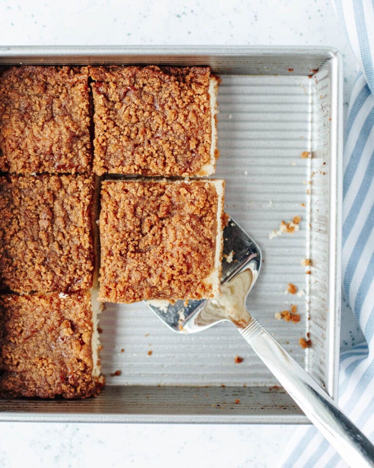 Looking for a delicious and easy dessert? This Quick Coffee Cake recipe requires minimal ingredients and can be whipped up in no time for a delicious anytime treat. Moist, fluffy, and packed with a cinnamon sugar streusel both throughout and on top!